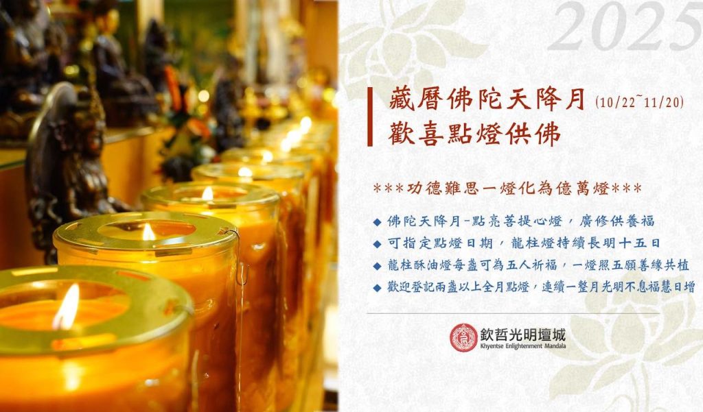 2025年10月22日~11月20日,是為佛陀天降吉祥月。佛教特別重視在殊勝月期間行善去惡,呼籲大家盡己所能行持守戒、放生、吃素、念經、持咒、供燈等殊勝善法,廣作功德,並迴向虛空法界一切眾生,願眾生皆平安喜樂,值此殊勝月(特別是初一至十五日上弦月期間),所做的一切善業功德,均不可思議地增長百千萬億倍,故又稱為大吉祥月。是以欽哲光明壇城將為師長、會員、護持者全月點燈祈福迴向、獻上祝福的吉祥緣起,願光明普照。同時開放個人為親友供燈: