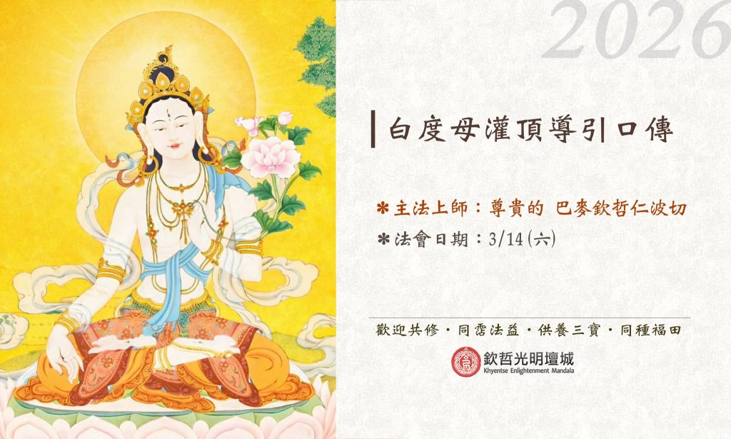 這次,欽哲光明壇城特別在2026年新春,恭請尊貴的第三世巴麥欽哲仁波切親自主持「白度母灌頂與成就法導引口傳」。這是一場難得的殊勝因緣,讓我們有機會直接領受白度母的七眼加持——那七隻慈眼,不僅照見十方佛土,更細細觀察六道眾生的苦難根源,特別是那些因冤債、惡業、魔障而起的病痛與災厄,一一為我們消融。