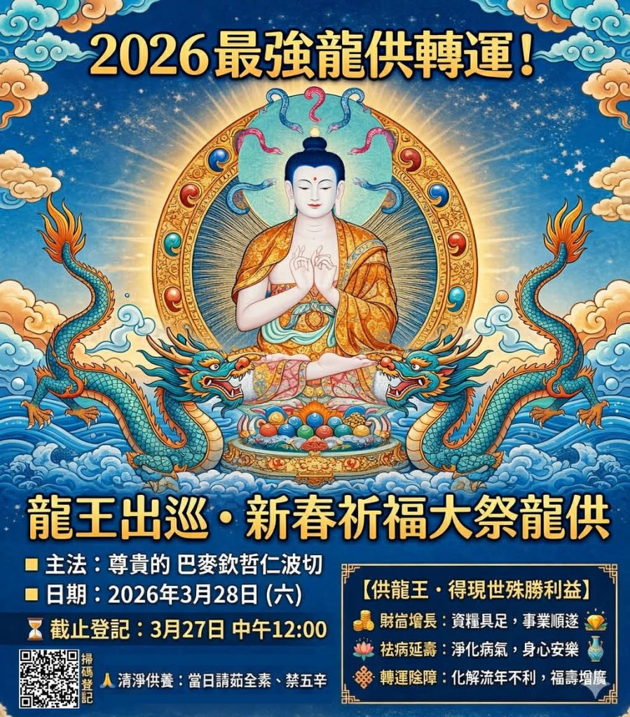 在藏傳佛教傳統中,龍族是掌管大地上財富、健康、氣候與運勢的重要守護者。2026年3月28日適逢藏曆二月初十「龍王出巡日」,當天舉行龍供,其功德與感應將更為殊勝。